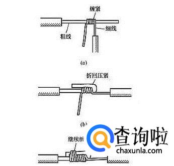不同截面单股铜导线接线,先将细铜导线紧密缠绕在粗铜导线上5~6圈,然后将粗铜导线的线头折回,紧压在缠绕层上,再用细铜导线在上继续缠绕3~4圈,即可。