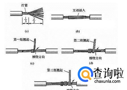 单股铜导线接线,如图所示先将两股铜线x形交叉,然后互相缠绕紧,即可。