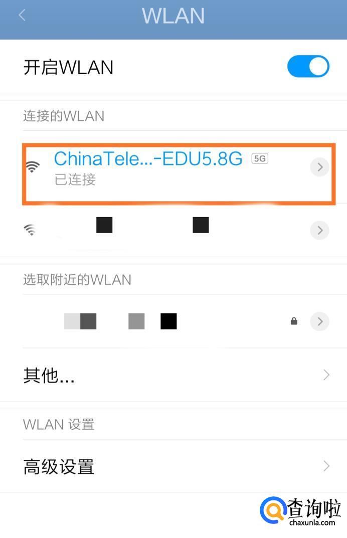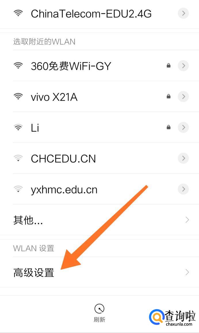 在WLAN设置页面中,点击页面下方的高级设置。