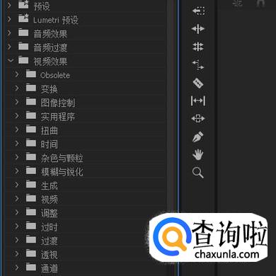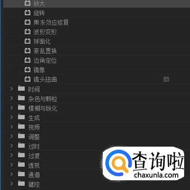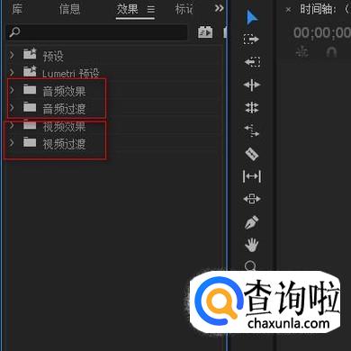 效果面板这里,是软件内置的诸多效果。这里分视频与音频两大类的。鼠标点一下文件夹左侧的折叠按钮,即可把内容给展开来。