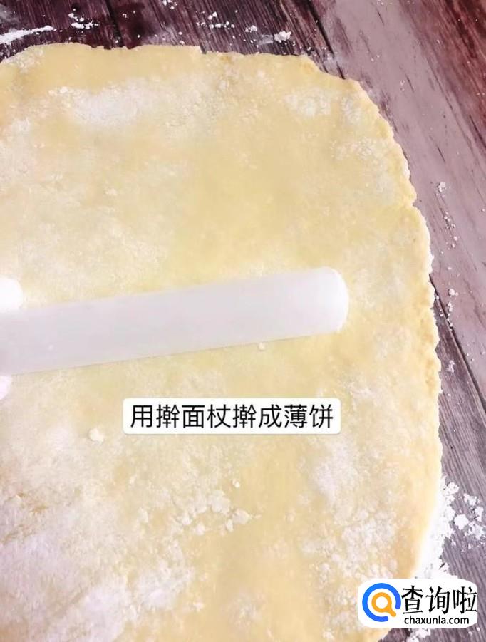接着用擀面杖擀成薄饼,如下图所示。小贴士关于薄饼的厚度,大家可以根据自己喜欢吃厚度来决定。