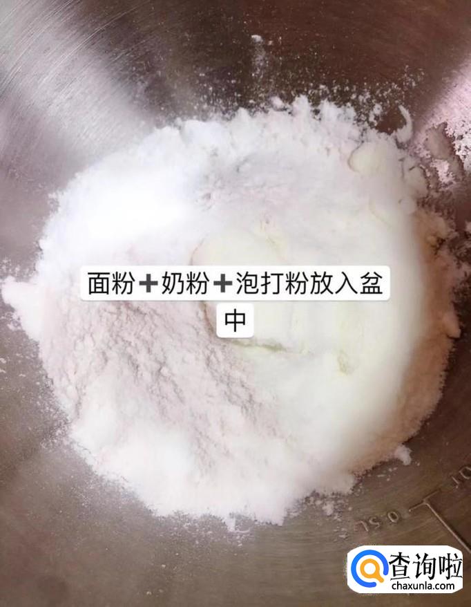 首先,将面粉奶粉和泡打粉放入盆中,搅拌均匀,如下图所示。