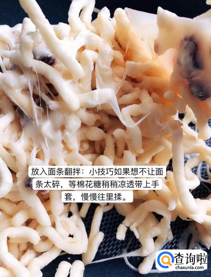 然后放入炸好的面条搅拌均匀,如下图所示。小贴士:大家在做这一步的时候,如果害怕面条太碎,可以等棉花糖稍微冷却一点,再用手把面条塞进棉花糖里面就可以了。