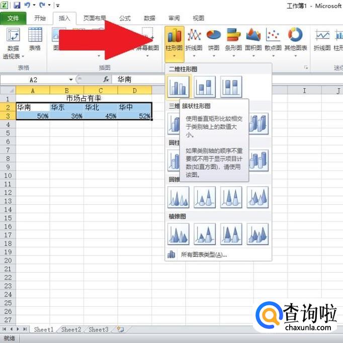 接着点击“柱形图”按钮,在这里我们点击使用“二维柱形图”。除了二维柱形图,还有各种各样柱形图可以用来表示百分比。