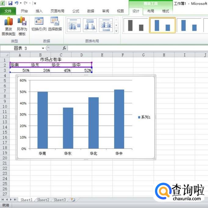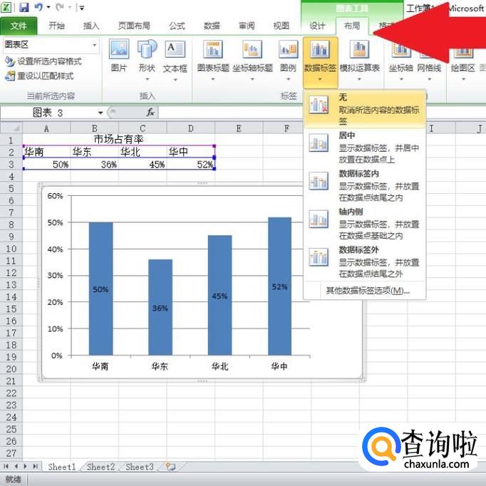 为了使柱形图能够直观和形象,我们再点击进入“设计”选项卡,接着点击“数据标签”按钮,这样就能把百分比添加到图表上。