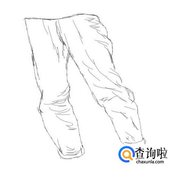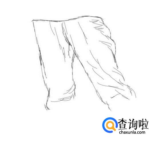 首先画出人物的臀部,然后在臀部的下面画出人物站立的大腿,并在上面画出裤子的结构线,如图所示: