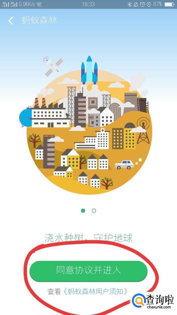 如果是第一次加入的话,是需要我们点击“同意协议并进入”,点击确定开通蚂蚁森林。如果不点击同意的话,是不能使用蚂蚁森林的。