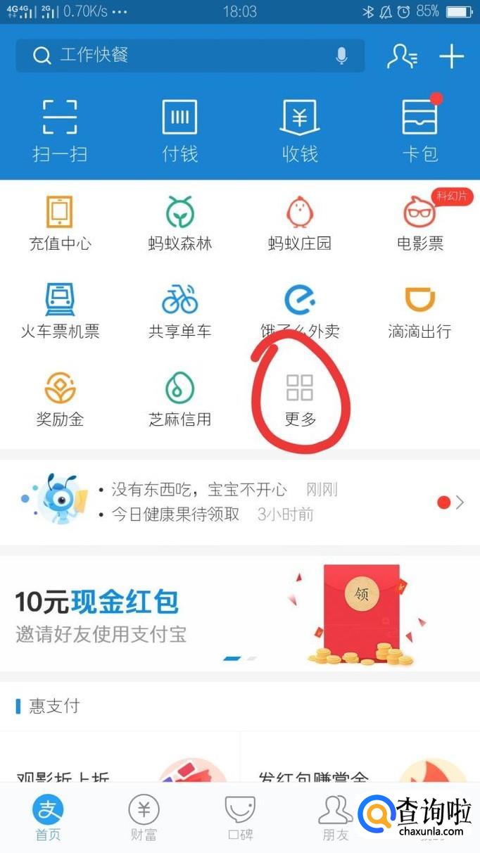 首先需要我们在手机下载支付宝APP,然后登录支付宝之后,在首页面中需要找到“更多”选项,点击进入下一个操作页面。
