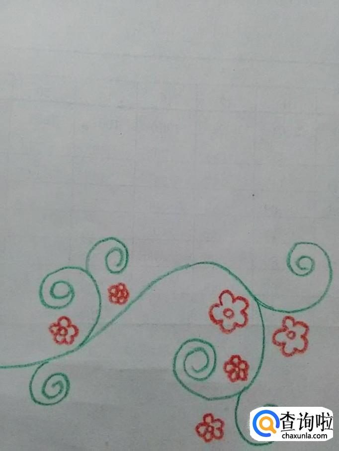 在每个花芯的周围,画五条相连的弧线,表示花瓣,花藤就画完了。