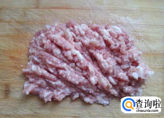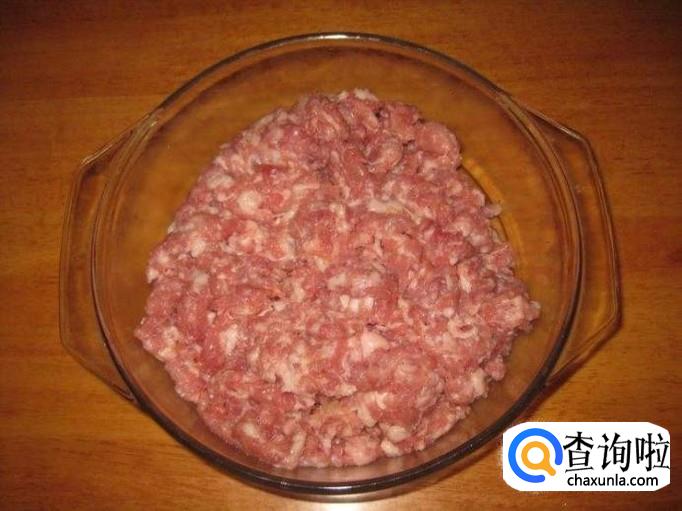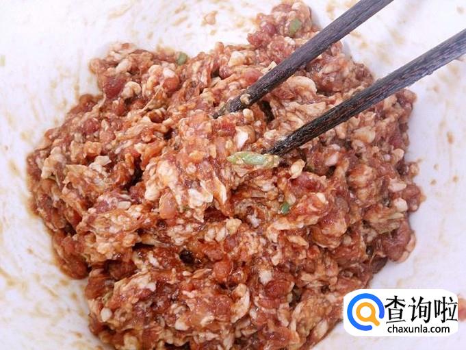 将猪肉馅放入大碗中,倒入葱姜水,进行搅拌。