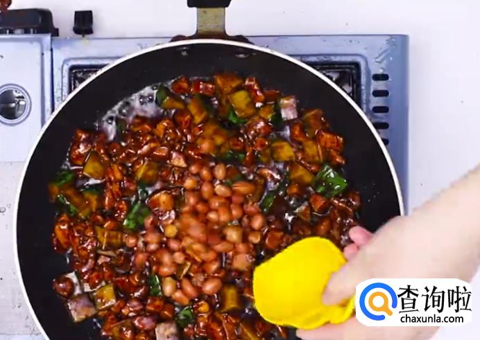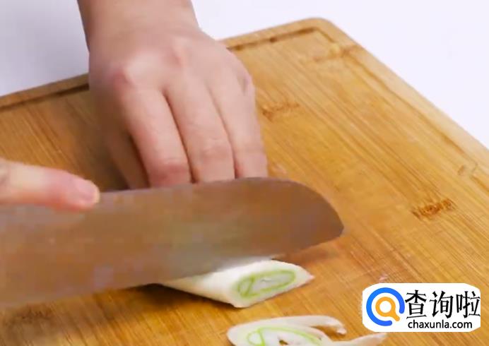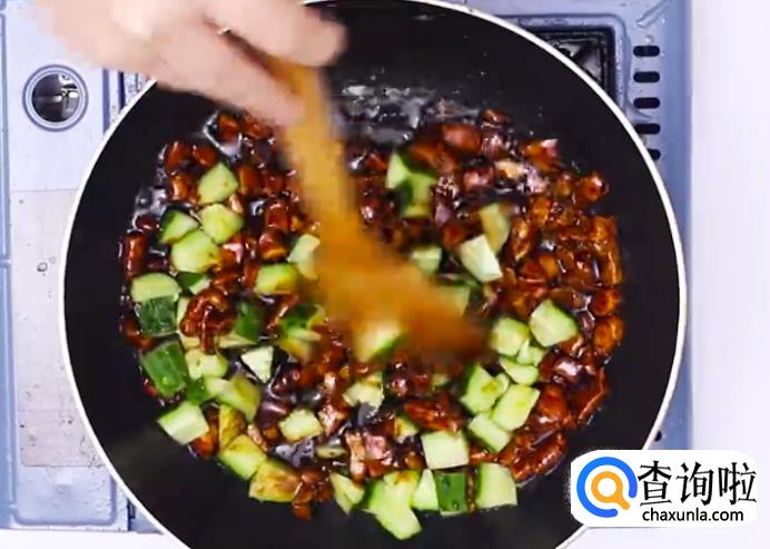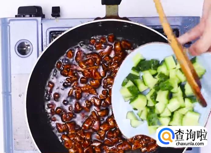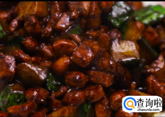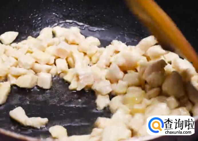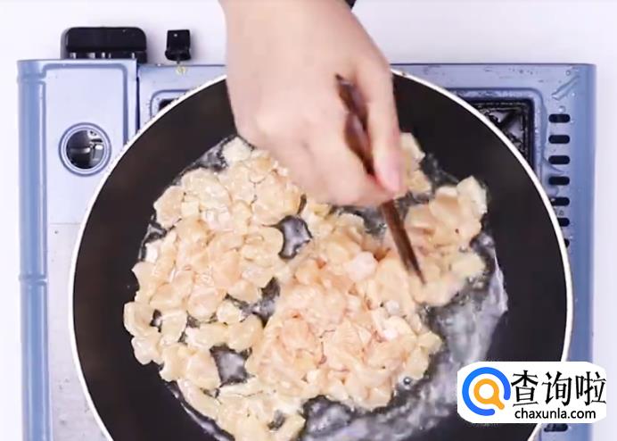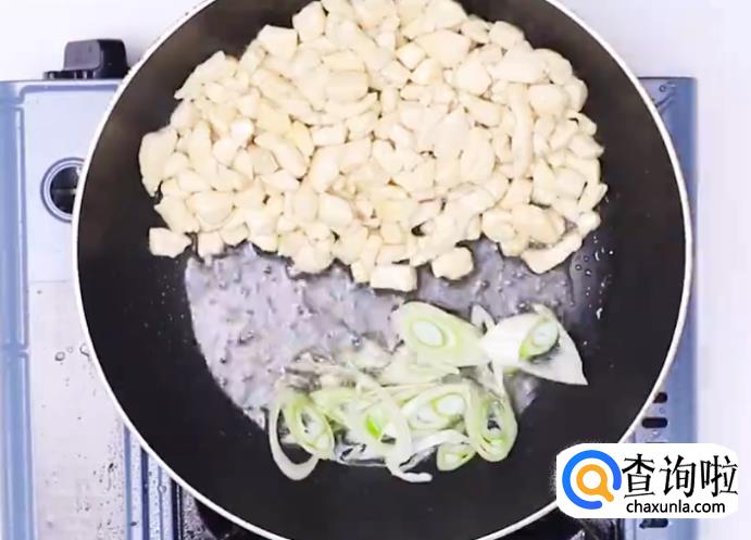 热油铺底,鸡肉丁下锅炒至变色。加入葱段翻炒均匀。