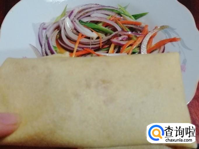 取出适量新鲜的粗粮煎饼,把煎饼铺平,放入调好入味的,圆葱胡萝卜拌葱丝,把煎饼如图所示折叠卷好,就可以享受美味了,这样我们好吃的三丝卷煎饼就做好了,原汁原味清香好吃。