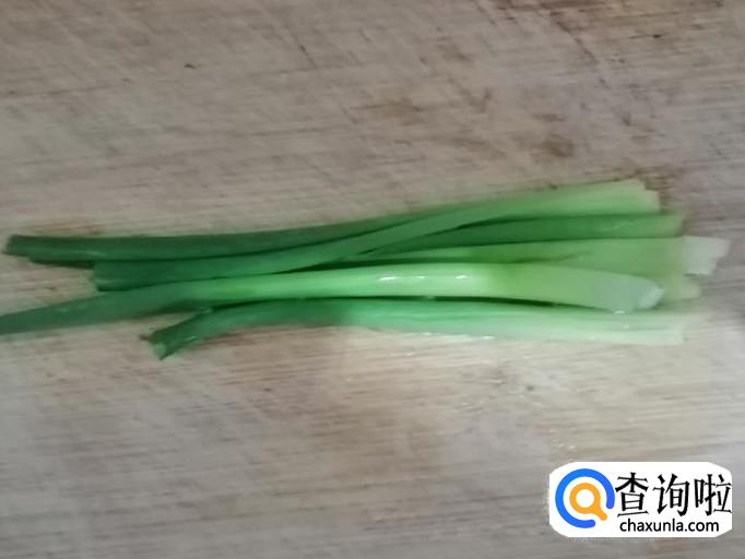 取适量新鲜的青葱叶,把葱摘掉黄叶,用清水把葱洗净,然后把葱切成细丝待用,用大葱也可以,主要选用青葱叶,是为了搭配另两个食材会更好看。