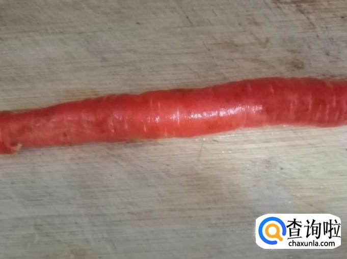 取一小根新鲜的胡萝卜,用清水把胡萝卜洗净,用刀切掉胡萝卜头尾,然后把胡萝卜切细丝待用。