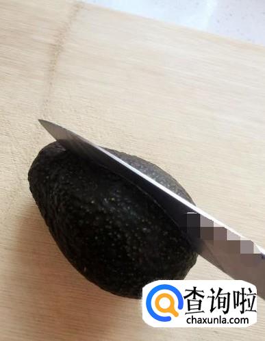 将买来的牛油果放在案板上面,用刀子纵向切牛油果,当到碰到核的时候停止向下切,如图所示。