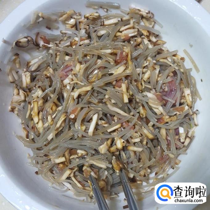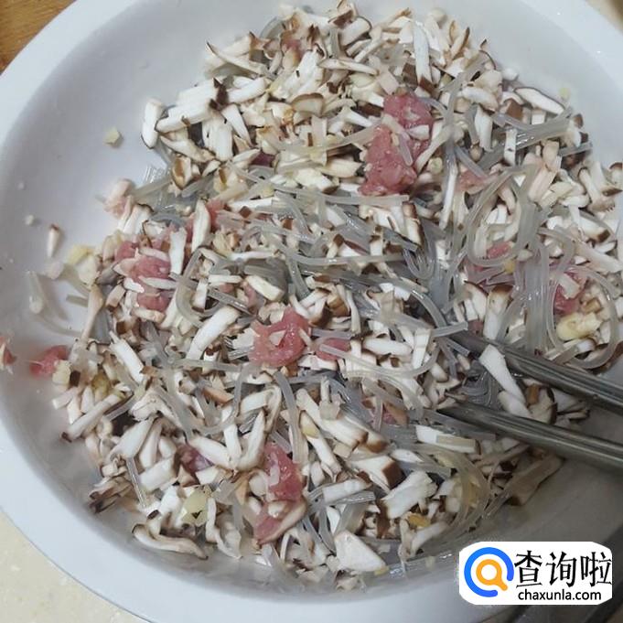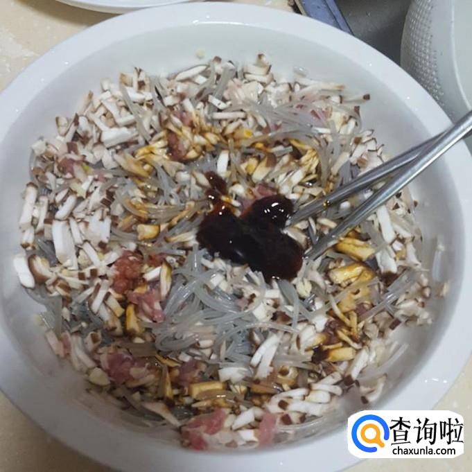 把切断的粉丝,切好的肉丁,香菇同时倒入碗稍微搅拌下,再少量料酒、酱油、蚝油、盐搅拌均匀