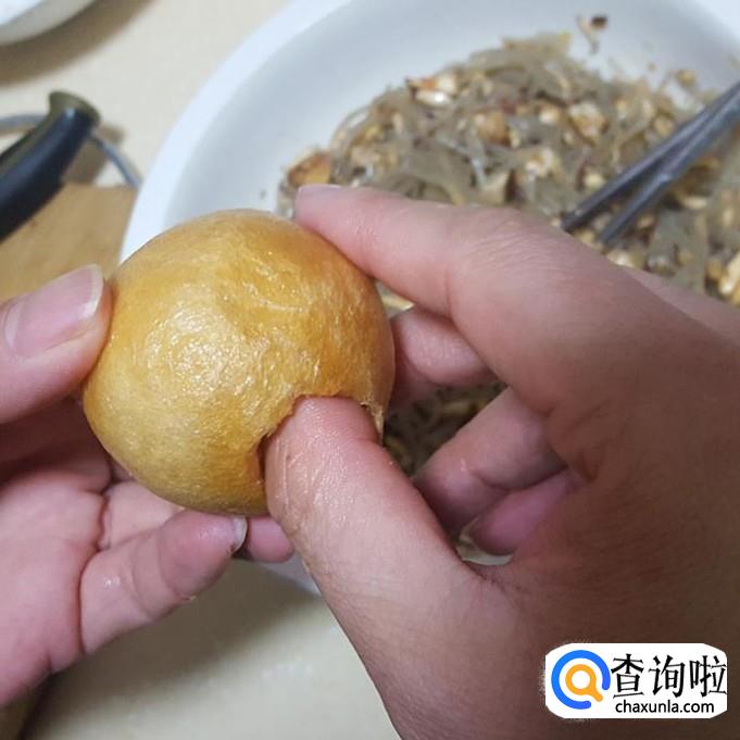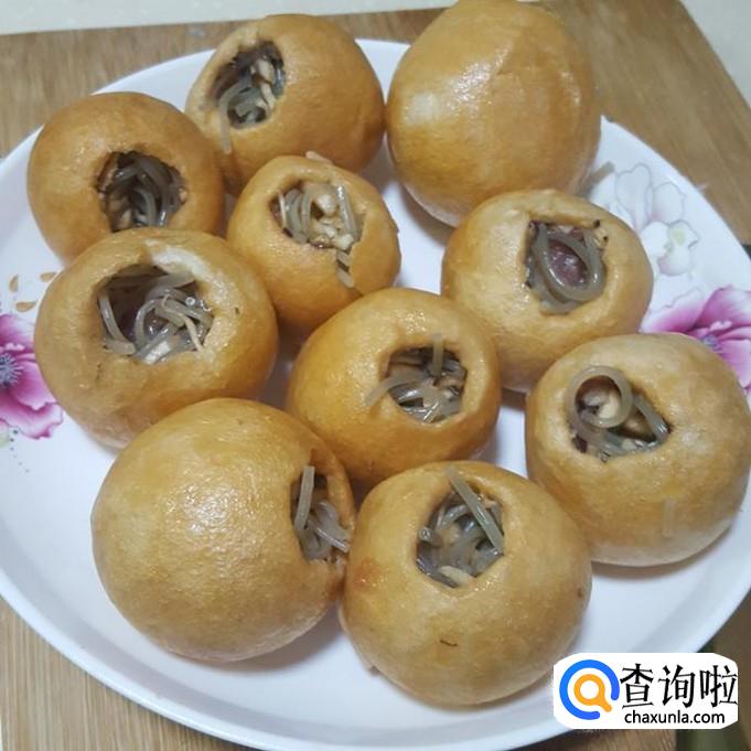用手或筷子在面筋过上挖一个小洞,并将里面尽量压平时,留出比较多的空间塞搅拌好粉丝馅