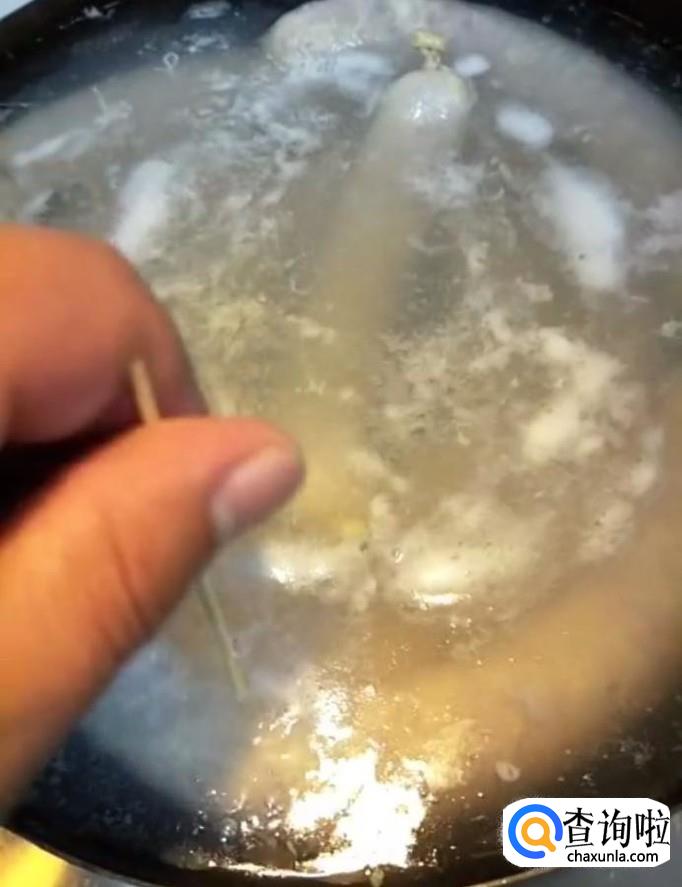 接着我们在锅中烧水,水开放入灌好的肉肠,开小火煮15分钟,期间用牙签扎几个小孔排气