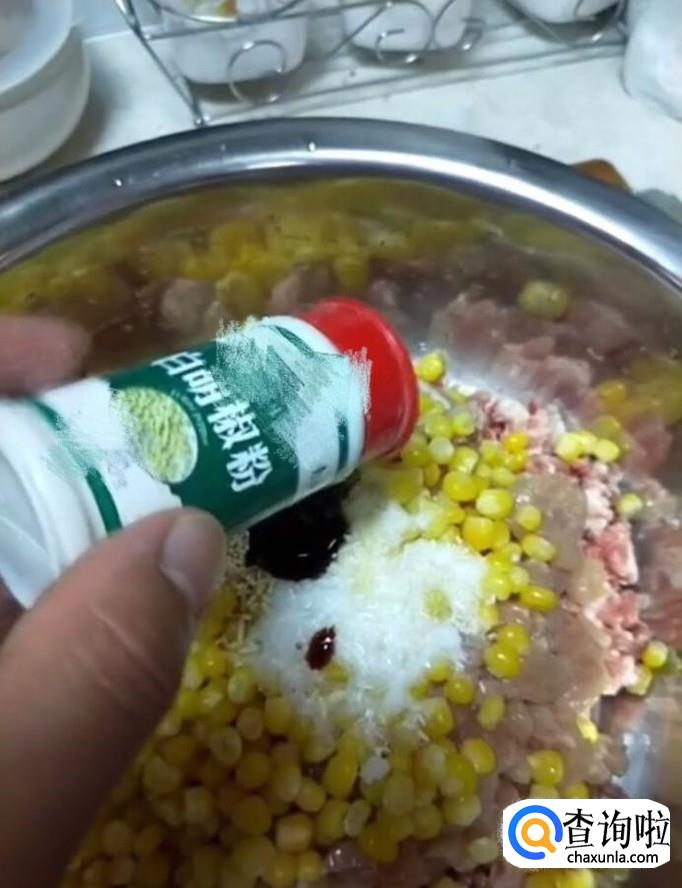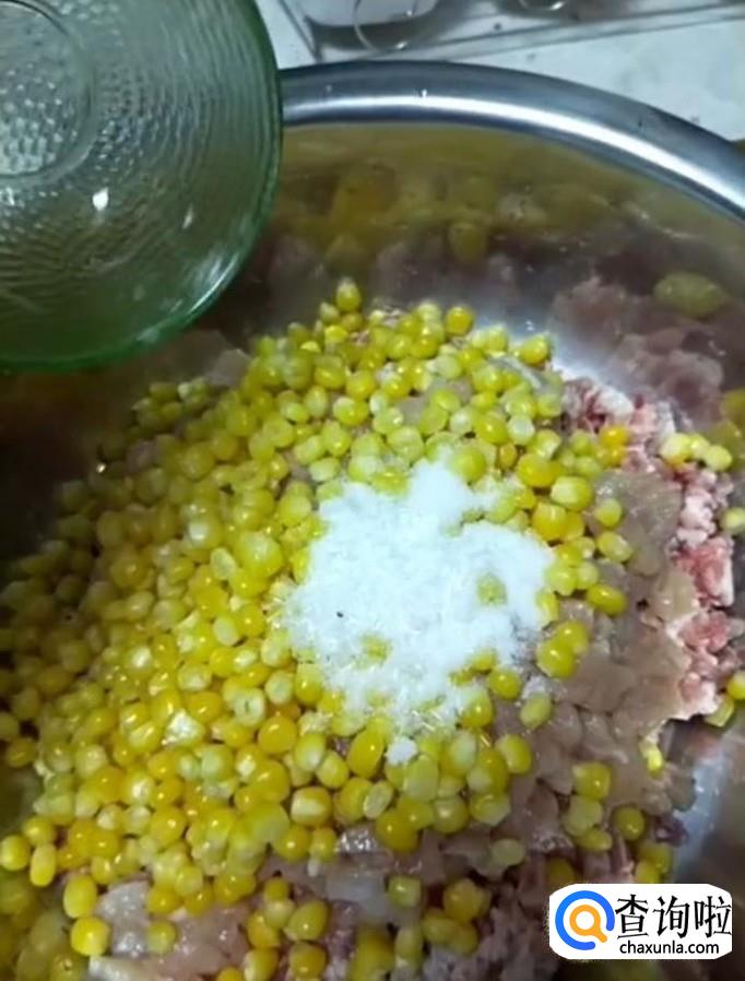然后我们把玉米粒在热水锅中焯一下捞出放入盆中,加人适量的盐,味精,鸡精