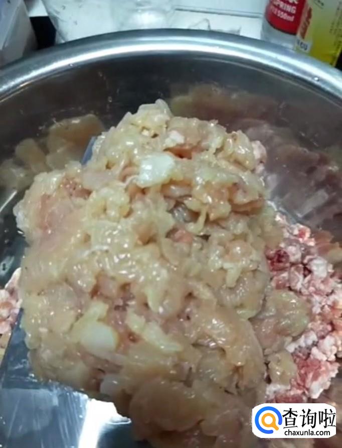 接着我们将猪肉剁成肉泥,放入一个盆中,加入适量剁好的鸡脯肉