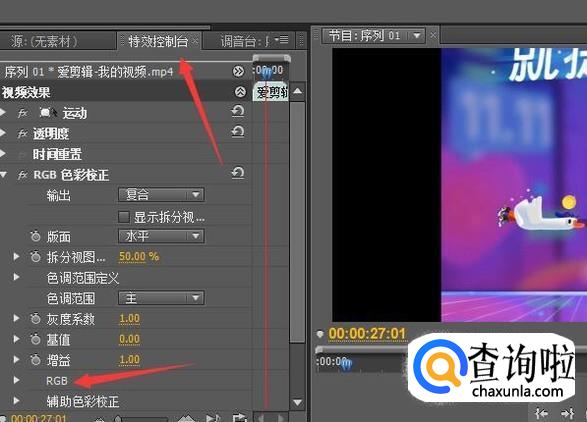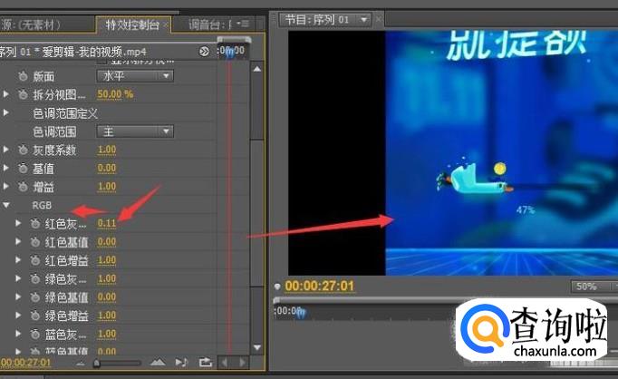 再点击特效控制台,点击RGB如图,RGB下方会展开颜色调节。