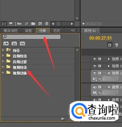 在Pr的左下角点击效果选项,在列表框中找到视频特效,点击扩展目录。