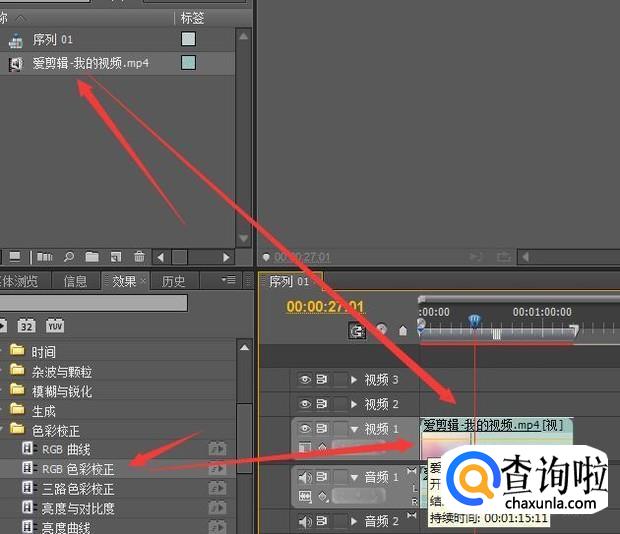 将导入的视频拉入到序列中的视频轨道上,再把色彩校正中的RGB色彩校正拉到轨道上的视频上。