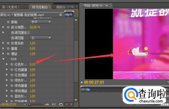 比如对着红色灰右侧的数字按住往右拉大数值,我们看到视频就变得更红了。