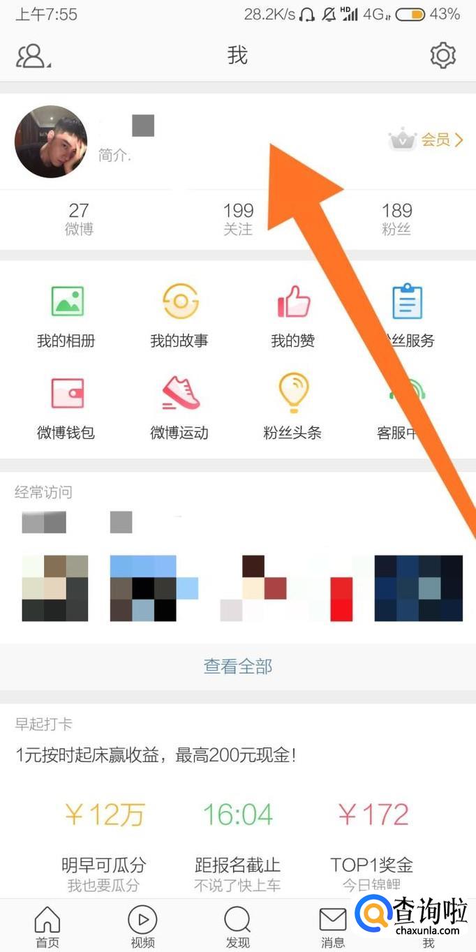 首先进入微博客户端页面“我”,然后点击微博头像右侧的空白区域。