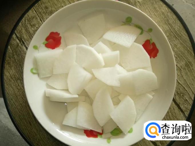 取三分之一根白萝卜,将白萝卜去皮,洗净,切成薄片;白萝卜切薄一点,更容易熟;白萝卜煮得烂烂的,才好吃哦;