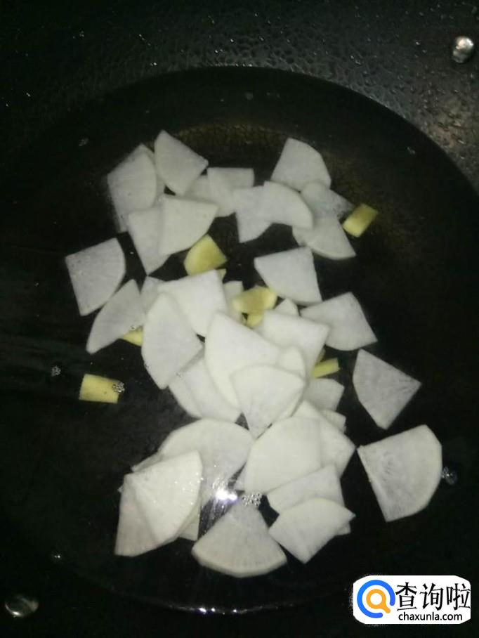 将白萝卜和姜片让人锅里,加入适量的水,煮开;再继续煮到白萝卜熟了、软了为止;