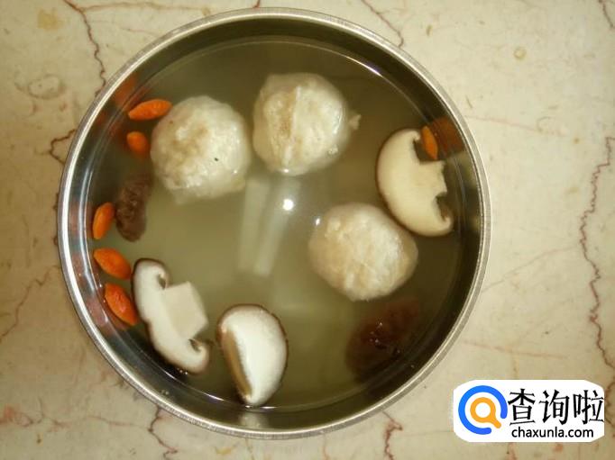 将香菇、枸杞也放入锅里,一起煮;煮到开了后,将鱼丸下入锅里,一起煮;