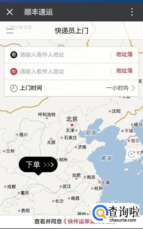 进入页面后,按照提示输入寄件人地址和收件人地址,还可以用选择上门取件时间,默认的是一小时内上门取件