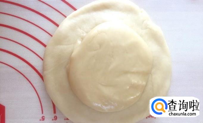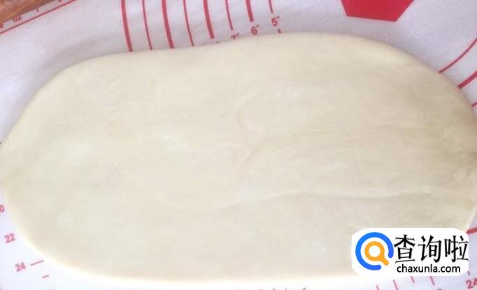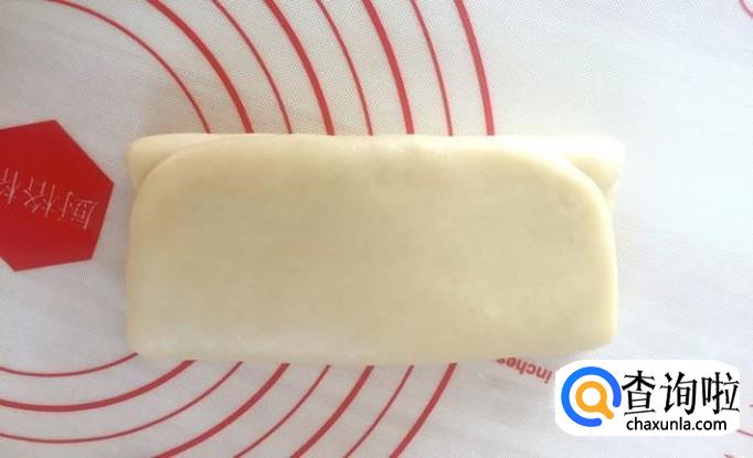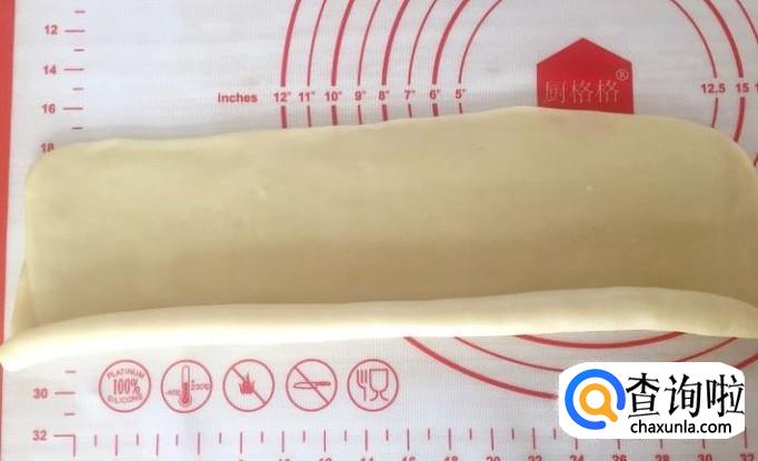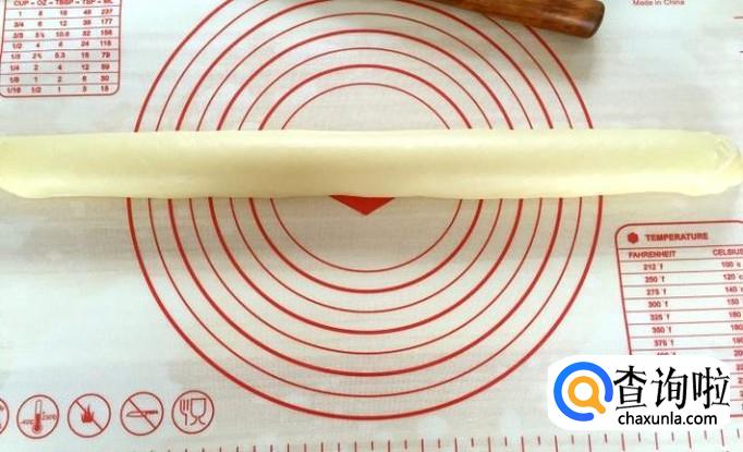 3、擀面皮的时候两端的口朝上往中间收一下再擀,这样包裹在里面的油皮就不会被擀到外面了。