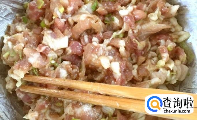 准备馅料:猪肉切成小块,依次放入盐、葱花、姜末、十三香、生抽、料酒、鸡精、香油适量(就像和包子馅儿一样),搅拌均匀。