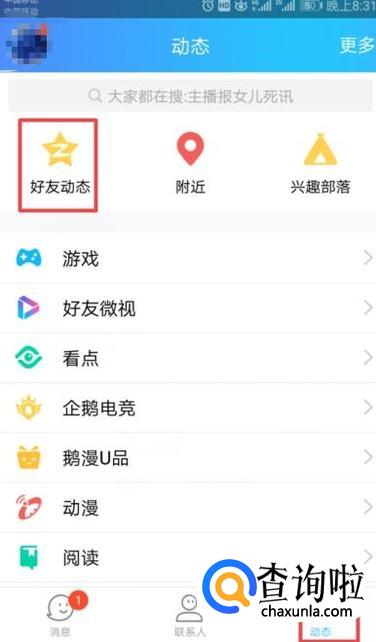 首先,我们登录我们的手机QQ,然后我们点击动态,之后我们点击好友动态;