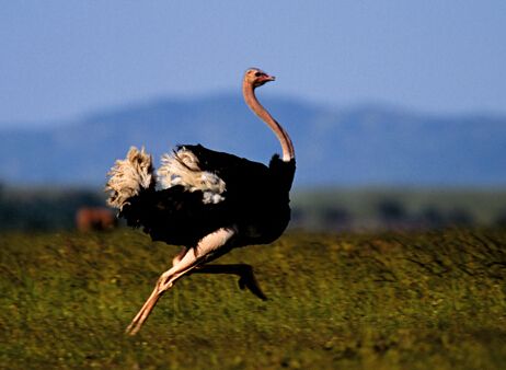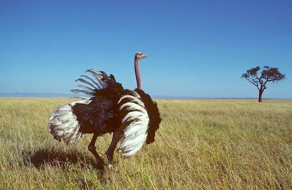 值得庆幸的是,有所失必有所得,鸵鸟虽不会飞,但它却是世界上奔跑速度最快的鸟。鸵鸟发达的腿部肌肉,使得它的奔跑能力超强,平时速度达80km/h,最快可达90km/h。它跳跃可腾空2.5m,一步可跨越8m,冲刺速度在每小时70km以上。