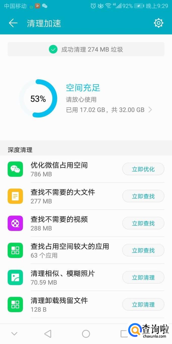 系统提示成功清理缓存垃圾,手机空间很充足,可放心使用。