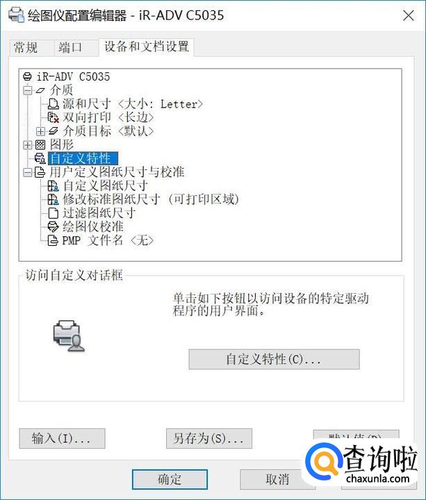 我们找到“特性”的菜单,选好打印机这里就可以点了。这里我们找到“自定义特性”。