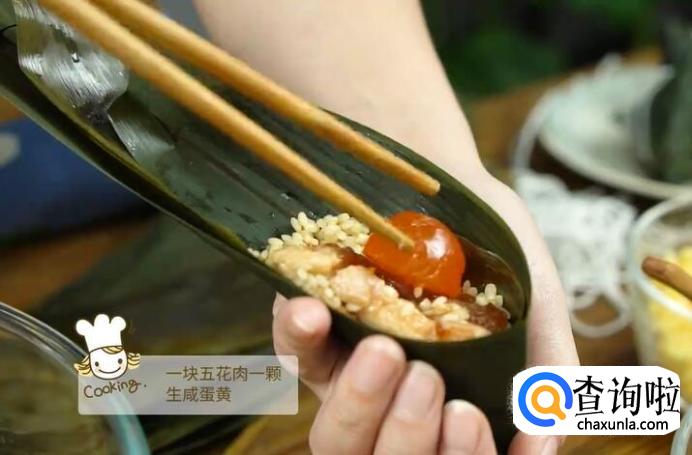 先加入糯米,然后加入一块五花肉和一颗生咸蛋黄。
