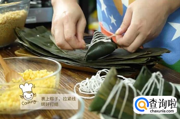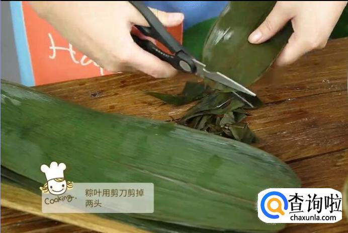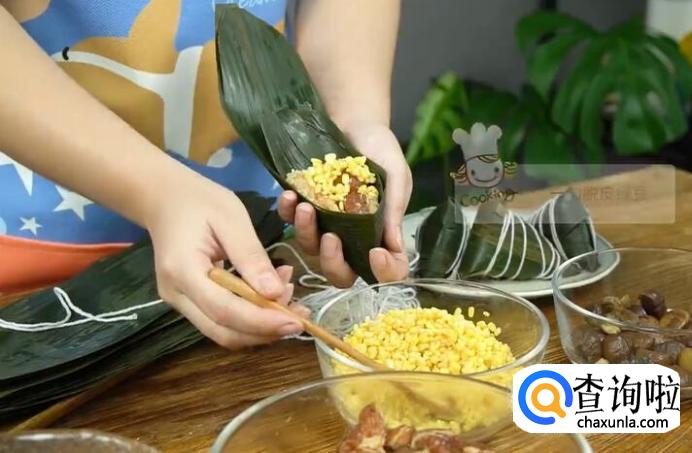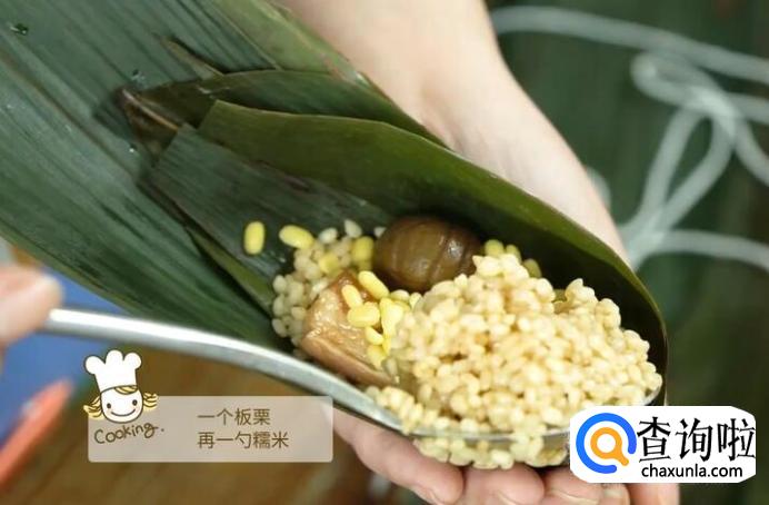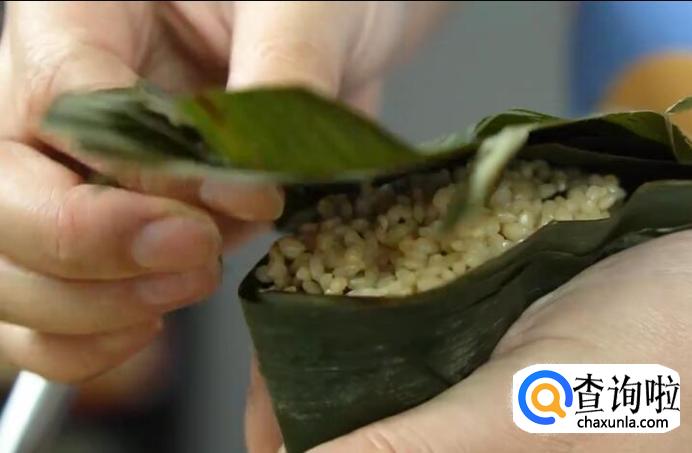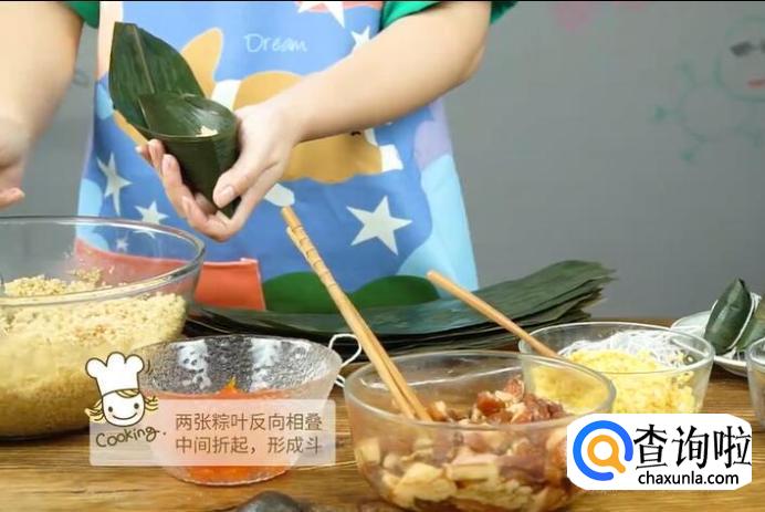 两张粽叶反向相叠,中间折起,形成一个斗的形状。