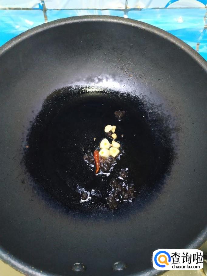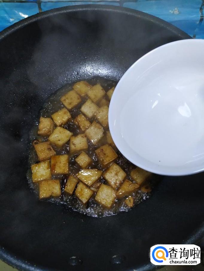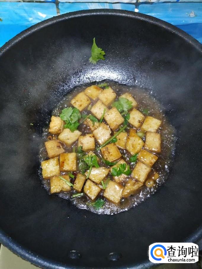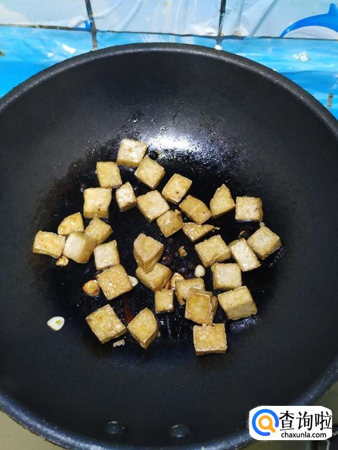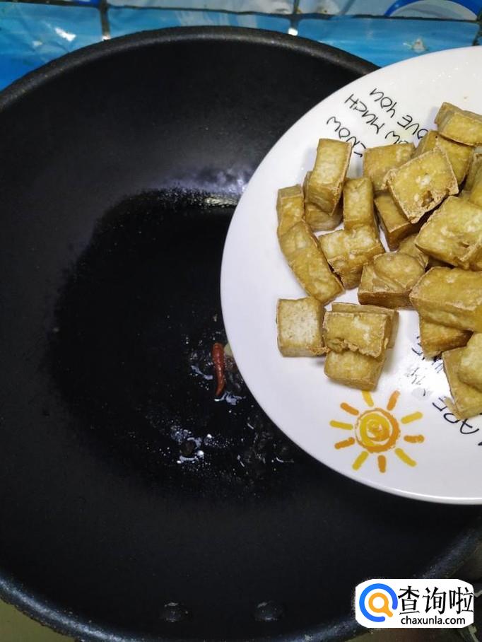 锅中留底油,放入适量干辣椒,豆豉,蒜片炒香,然后将炸好的豆腐,倒入锅中翻炒。