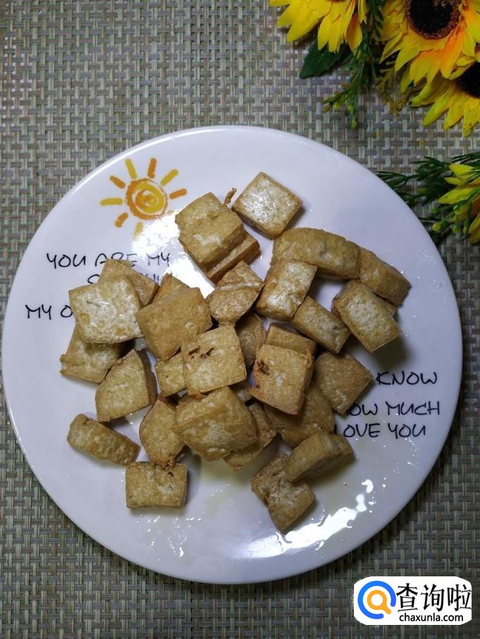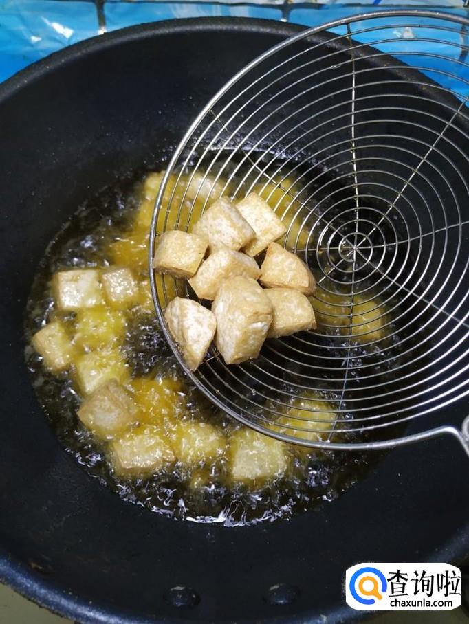 锅中放入适量油,油热后将豆腐放入锅中,小火慢炸,炸至外表金黄,捞出沥油,放入盘中备用。