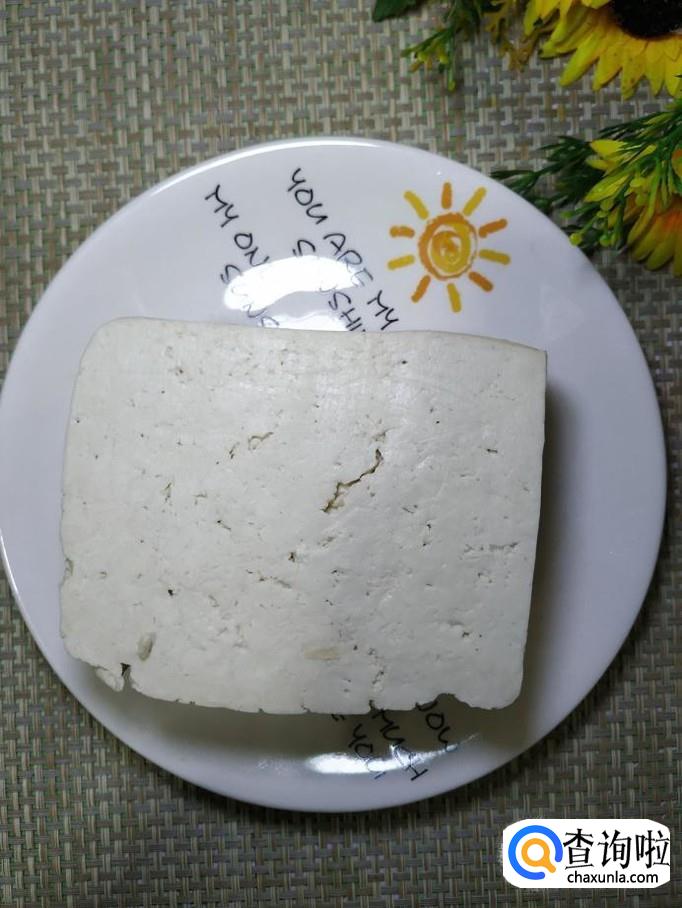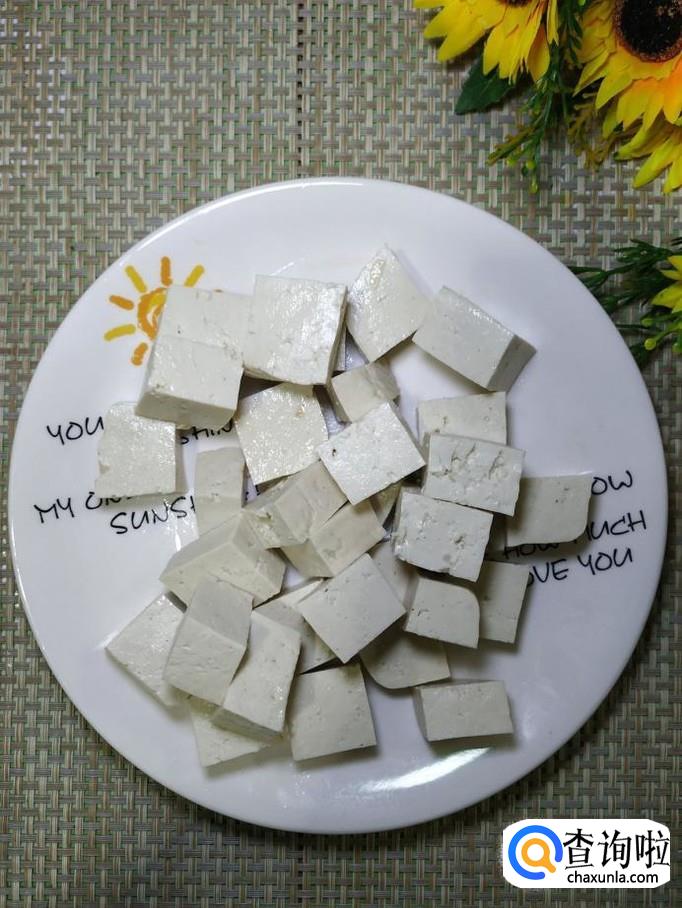 准备适量豆腐,洗净后切成块,放入盘中备用,这里选用的豆腐是老豆腐。