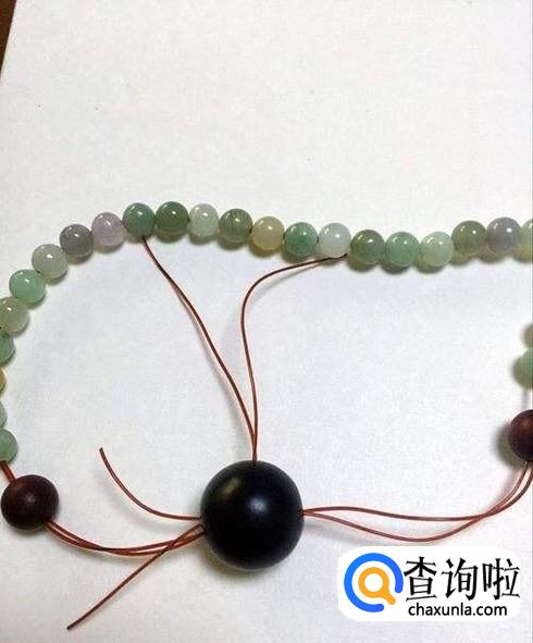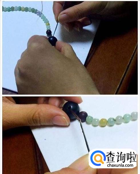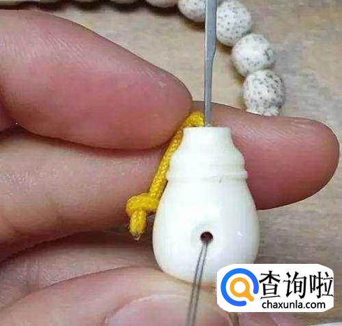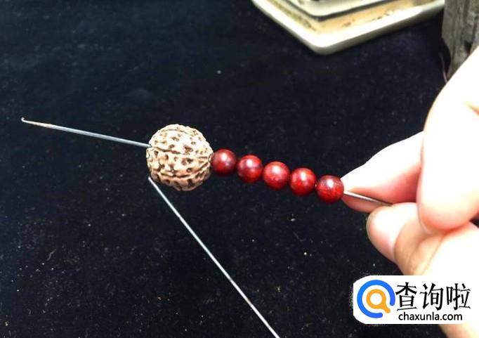 第三种方法叫做,双线同入法。就是把两端线和在一起,又横口穿进去,当线抵在了珠壁内时,我们用一根牙签从一端口把线引出来,然后捂住一根线,再用牙签把另一根线引到另一端口,这样三通也就穿好了。