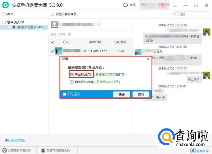 找到聊天记录后,选中该联系人,点击下方的恢复按钮,将记录以文本的形式保存到电脑上。