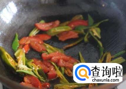 炒出辣味后,将西红柿放入锅中,加入适量的盐,青椒和西红柿都是可以生吃的蔬菜,不需炒太长时间,西红柿炒到软烂、入味,就可以出锅了。