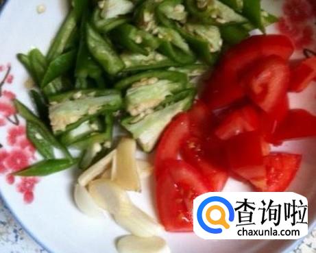 将青椒和西红柿切成均匀的小块,再准备几瓣蒜。