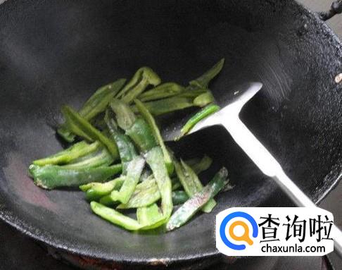 先将青椒放入锅中,用铲子翻炒。