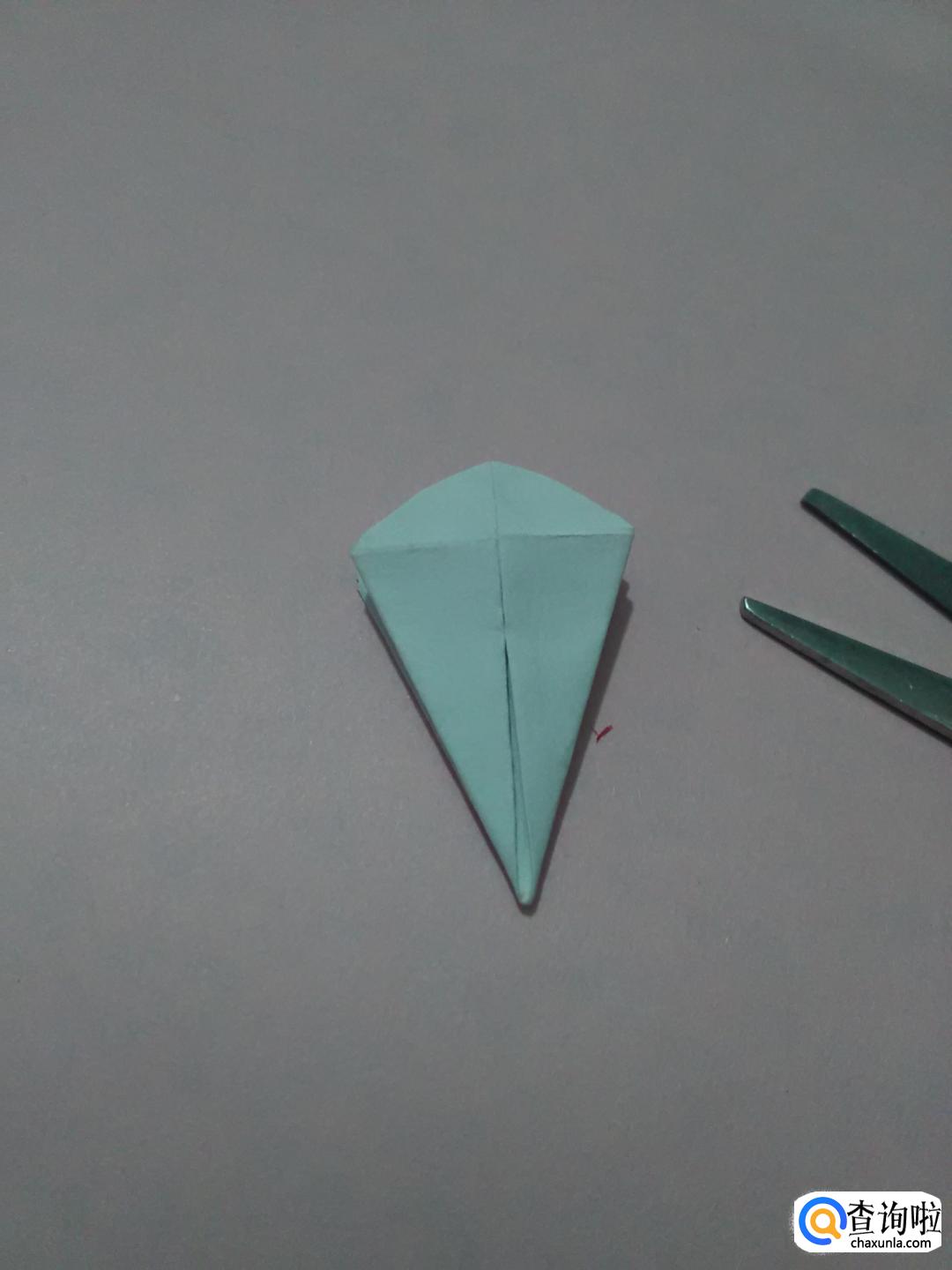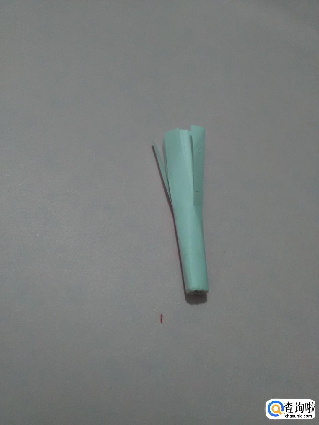 用剪刀把花朵下面剪掉一个小尖儿,把叶子的尖儿插进花朵下面的小孔中,郁金香花就折完了。